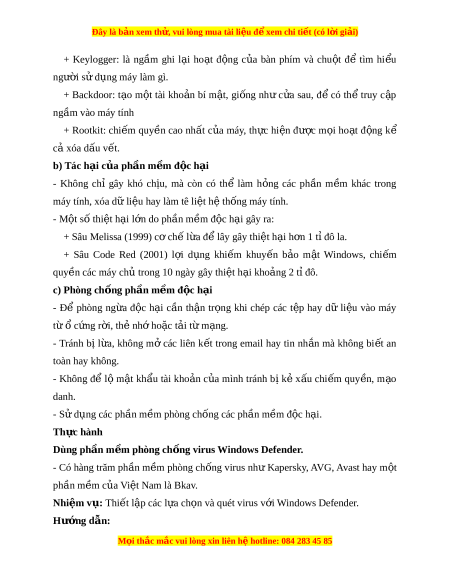 máy tính, xóa dữ li u hay l ệ àm tê li t ệ h t ệ h ng m ố áy tính. - M t ộ số thi t ệ h i ạ l n do ph ớ n m ầ m ề đ c h ộ i ạ gây ra: + Sâu Melissa (1999) c ch ơ ế l a đ ừ l ể ây gây thi t ệ h i ạ h n ơ 1 t đô l ỉ a. + Sâu Code Red (2001) l i ợ d ng ụ khi m ế khuy n ế b o ả m t ậ Windows, chi m ế quy n các ề máy ch t ủ rong 10 ngày gây thi t ệ h i ạ kho ng ả 2 t đô. ỉ c) Phòng ch ng ph ố n m ầ m ề đ c h ộ i ạ - Để phòng ng a ừ đ c ộ h i ạ c n ầ th n ậ tr ng ọ khi chép các t p ệ hay dữ li u ệ vào máy t ừ ổ c ng r ứ i ờ , th nh ẻ ho ớ c ặ t i ả t m ừ ng. ạ - Tránh bị l a, ừ không mở các liên k t ế trong email hay tin nh n ắ mà không bi t ế an toàn hay không. - Không để lộ m t ậ kh u ẩ tài kho n ả c a ủ mình tránh b ịk ẻ x u ấ chi m ế quy n, ề m o ạ danh. - S d ử ng các ụ phần m m ề phòng chống các ph n m ầ m ề đ c ộ h i ạ . Thực hành Dùng ph n m ầ m ề phòng ch ng vi ố rus Windows Defender. - Có hàng trăm ph n ầ m m ề phòng ch ng ố virus nh