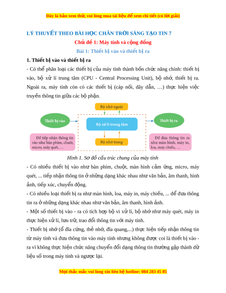 Đây là bản xem th , vu ử i lòng mua tài li u ệ đ xe ể m chi ti t (c ế ó l i ờ gi i ả ) LÝ THUY T Ế THEO BÀI H C Ọ CHÂN TR I Ờ SÁNG T O Ạ TIN 7 Chủ đ 1: ề Máy tính và c ng ộ đ ng ồ Bài 1: Thi t ế b vào và t ị hi t ế b ra ị 1. Thi t ế b vào và t ị hi t ế b ra ị - Có thể phân lo i ạ các thi t ế b ịc a ủ máy tính thành b n ố ch c ứ năng chính: thi t ế bị