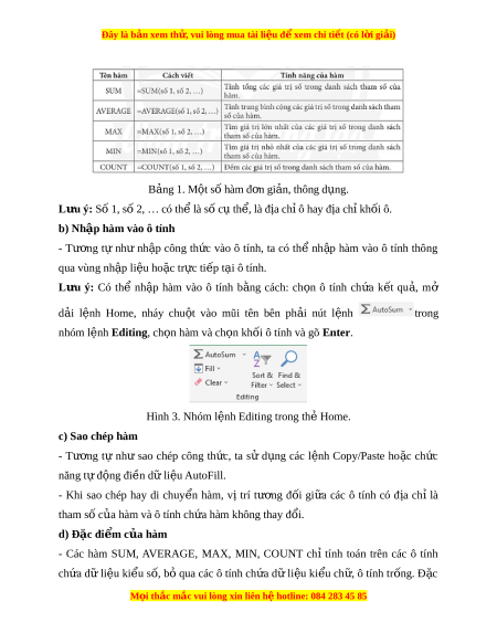 Đây là bản xem th , vu ử i lòng mua tài li u ệ đ xe ể m chi ti t (c ế ó l i ờ gi i ả ) B n ả g 1. M t ộ s ố hàm đ n ơ gi n ả , thông d n ụ g. L u ư ý: S ố 1, s ố 2, … có th ể là s ố c ụ th , ể là đ a ị ch ỉô hay đ a ị ch ỉkh i ố ô. b) Nh p hàm ậ vào ô tính - Tư ng ơ tự như nh p ậ công th c ứ vào ô tính, ta có th ể nh p ậ hàm vào ô tính thông qua vùng nh p ậ li u ho ệ c t ặ r c t ự i p t ế i ạ ô tính. Lưu ý: Có thể nh p ậ hàm vào ô tính b ng ằ cách: ch n ọ ô tính ch a ứ k t ế qu , ả mở d i ả l nh ệ Home, nháy chu t ộ vào mũi tên bên ph i ả nút l nh ệ trong nhóm l nh ệ Editing, ch n ọ hàm và ch n kh ọ
