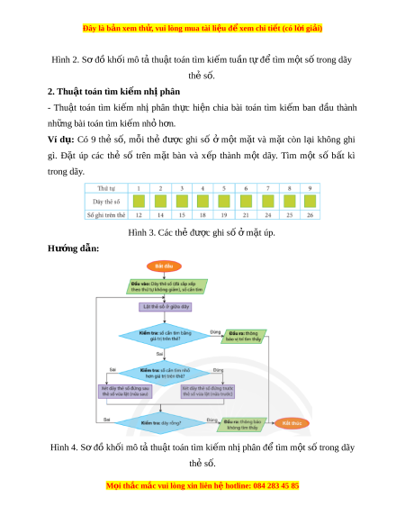 Đây là bản xem th , vu ử i lòng mua tài li u ệ đ xe ể m chi ti t (c ế ó l i ờ gi i ả ) Hình 2. S đ ơ ồ khối mô t t ả hu t ậ toán tìm ki m ế tu n t ầ đ ự t ể ìm m t ộ s t ố rong dãy thẻ số. 2. Thu t ậ toán tìm ki m ế nh phâ ị n - Thu t ậ toán tìm ki m ế nhị phân th c ự hi n ệ chia bài toán tìm ki m ế ban đ u ầ thành nh n ữ g bài toán tìm ki m ế nh ỏ h n ơ . Ví d : ụ Có 9 thẻ s , ố m i ỗ thẻ đư c ợ ghi số ở m t ộ m t ặ và m t ặ còn l i ạ không ghi gì. Đ t