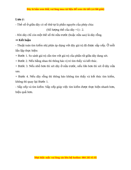 Đây là bản xem th , vu ử i lòng mua tài li u ệ đ xe ể m chi ti t (c ế ó l i ờ gi i ả ) Lưu ý: - Th s ẻ ố gi ở a dãy ữ có s t ố h t ứ l ự à ph n nguyên c ầ a ủ phép chia: (Số lư ng ợ th c ẻ a ủ dãy +1) : 2. - Khi dãy ch còn m ỉ t ộ th s ẻ t ố hì n a t ử rư c ( ớ ho c ặ n a s ử au) là dãy r ng. ỗ ⇒ K t ế luận - Thu t ậ toán tìm ki m ế nh ịphân áp d ng ụ v i