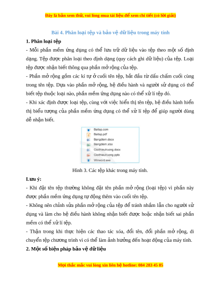 Đây là bản xem th , vu ử i lòng mua tài li u ệ đ xe ể m chi ti t (c ế ó l i ờ gi i ả ) Bài 4. Phân lo i ạ t p và b ệ o v ả ệ d l ữ i u t ệ rong máy tính 1. Phân lo i ạ t p ệ - Mỗi ph n ầ m m ề ng ứ d ng ụ có thể l u ư trữ dữ li u ệ vào t p ệ theo m t ộ số đ nh ị d ng. ạ T p ệ đư c ợ phân lo i ạ theo đ nh ị d ng ạ (quy cách ghi dữ li u ệ ) c a ủ t p. ệ Lo i ạ tệp đư c ợ nh n bi ậ t ế thông qua ph n m ầ r ở ng c ộ a t ủ p. ệ - Ph n ầ mở r ng ộ g m ồ các kí tự ở cu i ố tên t p, ệ b t ắ đ u ầ từ d u ấ ch m ấ cu i ố cùng trong tên t p. ệ D a ự vào ph n ầ mở r ng, ộ hệ đi u ề hành và ngư i ờ sử d ng ụ có thể bi t ế tệp thu c l ộ o i ạ nào, phần m m ề ng d ứ ng nào có t ụ h x ể ử lí t p đó. ệ - Khi xác đ nh ị đư c ợ lo i ạ t p, ệ cùng v i ớ vi c ệ hi n ể th ịtên t p, ệ h ệ đi u ề hành hi n ể thị bi u ể tư ng ợ c a ủ ph n ầ m m ề ng ứ d ng ụ có thể xử lí t p ệ để giúp ngư i ờ dùng d nh ễ n ậ bi t ế . Hình 3. Các t p khác ệ trong máy tính. Lưu ý: - Khi đ t ặ tên t p ệ thư ng ờ không đ t ặ tên ph n ầ mở r ng ộ (lo i ạ t p ệ ) vì ph n ầ này đư c ợ ph n m ầ m ề ng d ứ ng t ụ đ ự ng t ộ hêm vào cu i ố tên t p. ệ - Không nên ch nh ỉ s a ử ph n ầ mở r ng ộ c a ủ t p ệ đ ể tránh nh m ầ l n ẫ cho ngư i ờ sử d ng ụ và làm cho hệ đi u ề hành không nh n ậ bi t ế đư c ợ ho c ặ nh n ậ bi t ế sai ph n ầ m m ề có thể x l ử í t p. ệ - Th n ậ trong khi th c ự hi n ệ các thao tác xóa, đ i ổ tên, đ i ổ ph n ầ mở r ng, ộ di chuy n ể t p ch ệ ư ng ơ trình vì có th l ể àm nh h ả ư ng đ ở n ế ho t ạ đ ng c ộ a ủ máy tính. 2. M t ộ s bi ố n pháp b ệ o v ả d ệ l ữ i u ệ M i