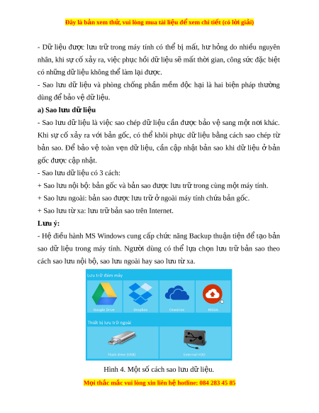 ư trữ trong máy tính có thể bị m t ấ , hư h n ỏ g do nhi u ề nguyên nhân, khi s ự c x ố y ả ra, vi c ệ ph c ụ h i ồ dữ li u ệ sẽ m t ấ th i ờ gian, công s c đ ứ c b ặ i t ệ có nh n ữ g d ữ li u ệ không thể làm l i ạ đư c ợ . - Sao l u ư dữ li u ệ và phòng ch n ố g ph n ầ m m ề đ c ộ h i ạ là hai bi n ệ pháp thư n ờ g dùng đ ể b o ả v ệ d ữ li u ệ . a) Sao l u d ư l ữ i u ệ - Sao l u ư dữ li u ệ là vi c ệ sao chép d ữ li u ệ c n ầ đư c ợ b o ả v ệ sang m t ộ n i ơ khác. Khi sự cố x y ả ra v i ớ b n ả g c, ố có thể khôi ph c ụ dữ li u ệ b ng ằ cách sao chép từ b n ả sao. Để b o ả vệ toàn v n ẹ dữ li u, ệ c n ầ c p ậ nh t ậ b n ả sao khi dữ li u ệ ở b n ả gốc đư c ợ c p nh ậ t ậ . - Sao l u d ư l ữ i u có 3 cách: ệ + Sao l u n ư i ộ b : ộ b n g ả c và b ố n ả sao đư c ợ l u t ư r t ữ rong cùng m t ộ máy tính. + Sao l u ngoài ư : b n ả sao đư c l ợ u t ư r ữ ngoài ở máy tính ch a ứ b n g ả c. ố + Sao l u t ư xa: ừ l u ư tr b ữ n ả sao trên Internet. Lưu ý: - Hệ đi u ề hành MS Windows cung c p ấ ch c ứ năng Backup thu n ậ ti n ệ đ ể t o ạ b n ả sao dữ li u ệ trong máy tính. Ngư i ờ dùng có thể l a ự ch n ọ l u ư trữ b n ả sao theo cách sao l u ư n i ộ b , s ộ ao l u ngoài ư hay sao l u t ư xa. ừ Hình 4. M t ộ số cách sao l u d ư l ữ i u. ệ M i