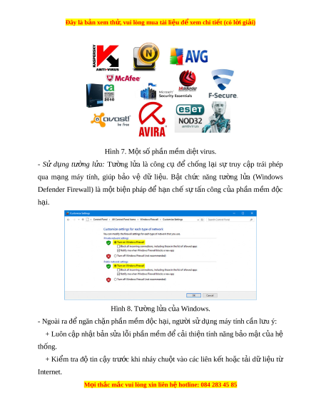 Đây là bản xem th , vu ử i lòng mua tài li u ệ đ xe ể m chi ti t (c ế ó l i ờ gi i ả ) Hình 7. M t ộ s ố ph n ầ m m ề di t ệ virus. - Sử d n ụ g tư n ờ g l a ử : Tư n ờ g l a ử là công cụ để ch n ố g l i ạ sự truy c p ậ trái phép qua m n ạ g máy tính, giúp b o ả vệ dữ li u ệ . B t ậ ch c ứ năng tư n ờ g l a ử (Windows Defender Firewall) là m t ộ bi n ệ pháp đ ể h n ạ ch ế s ự t n ấ công c a ủ ph n ầ m m ề đ c ộ h i ạ . Hình 8. Tư n ờ g l a ử c a ủ Windows. - Ngoài ra đ ể ngăn ch n ặ ph n ầ m m ề đ c ộ h i ạ , ngư i ờ s ử d n ụ g máy tính c n ầ l u ư ý: + Luôn c p ậ nh t ậ b n ả s a ử l i ỗ ph n ầ m m ề đ c ể i ả thi n ệ tính năng b o ả m t ậ c a ủ hệ th n ố g. + Ki m ể tra độ tin c y ậ trư c ớ khi nháy chu t ộ vào các liên k t ế ho c ặ t i ả d ữ li u ệ từ Internet. M i