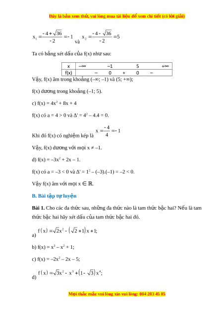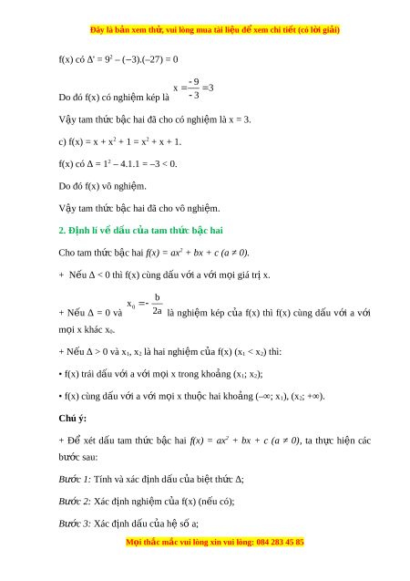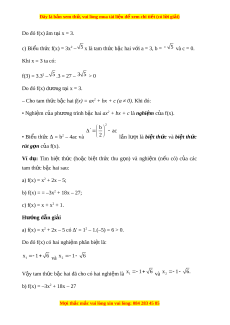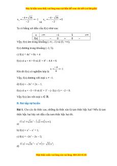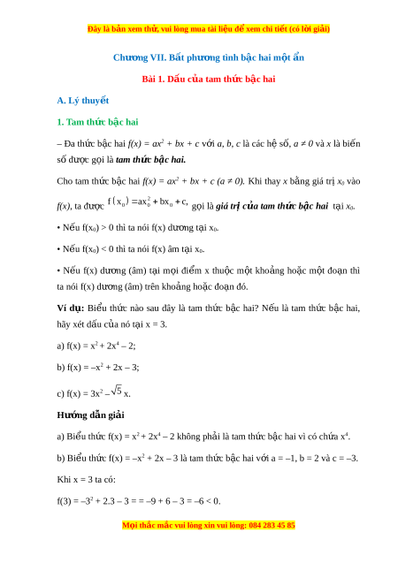Đây là bản xem th , vu ử i lòng mua tài li u ệ đ xe ể m chi ti t ế (có l i ờ gi i ả ) Chư ng ơ VII. B t ấ phư ng ơ tình b c ậ hai m t ộ n ẩ Bài 1. Dấu c a t ủ am th c b ứ c hai ậ A. Lý thuy t ế 1. Tam thức bậc hai – Đa th c ứ b c