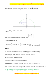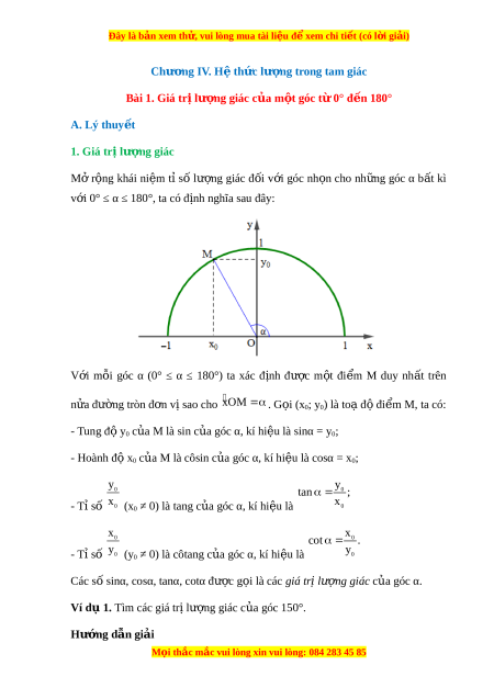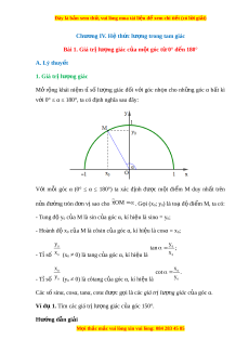 Đây là bản xem th , vu ử i lòng mua tài li u ệ đ xe ể m chi ti t ế (có l i ờ gi i ả ) Chư ng ơ IV. H t ệ h c ứ lư ng ợ trong tam giác Bài 1. Giá tr l ị ư ng gi ợ ác c a m ủ t ộ góc t 0° đ ừ n 180° ế A. Lý thuy t ế 1. Giá trị lư ng gi ợ ác Mở r ng ộ khái ni m ệ tỉ số lư ng ợ giác đ i ố v i ớ góc nh n ọ cho nh ng ữ góc α b t ấ kì v i