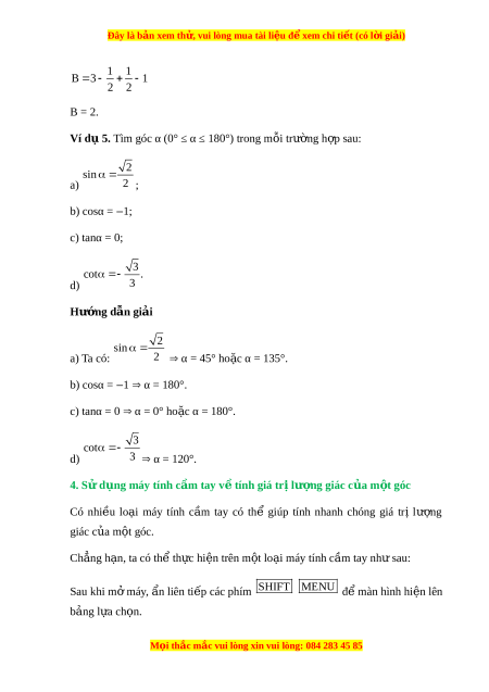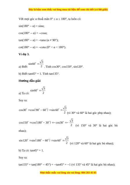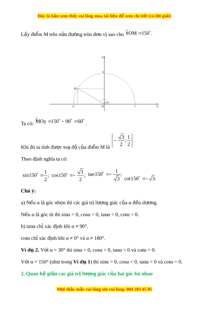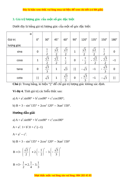 Đây là bản xem th , vu ử i lòng mua tài li u ệ đ xe ể m chi ti t (c ế ó l i ờ gi i ả ) 3. Giá tr l ị ư ng gi ợ ác c a m ủ t ộ s góc ố đ c bi ặ t ệ Dư i ớ đây là b ng gi ả á tr l ị ư ng gi ợ ác c a ủ m t ộ s góc đ ố c ặ bi t ệ : α Giá trị 0° 30° 45° 60° 90° 120° 135° 150° 180° lượng giác 1 2 3 3 2 1 sinα 0 1 0 2 2 2 2 2 2 3 2 1 1 2 3 cosα 1 0 ‒1 2 2 2 2 2 2 3 3 tanα 0 1 3 || 3 ‒1 0 3 3 3 3 cotα || 3 1 0 ‒1 3 || 3 3