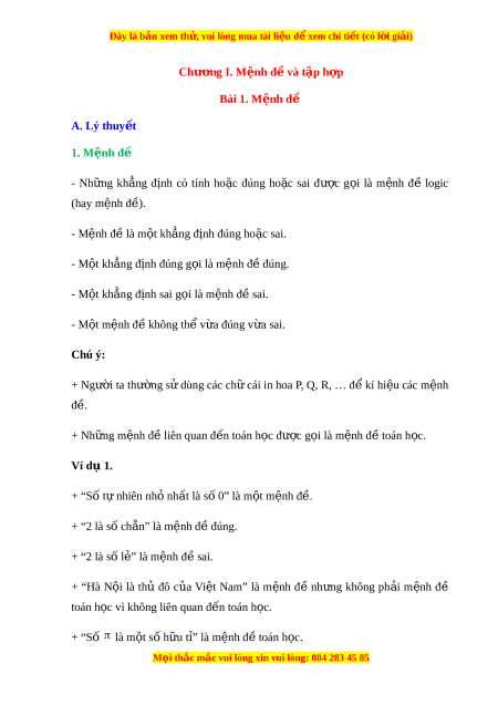 Đây là bản xem th , vu ử i lòng mua tài li u ệ đ xe ể m chi ti t ế (có l i ờ gi i ả ) Chư ng ơ I. M nh đ ệ và t ề p h ậ p ợ Bài 1. M nh đ ệ ề A. Lý thuy t ế 1. M nh đ ệ ề - Nh ng ữ kh ng ẳ đ nh ị có tính ho c ặ đúng ho c ặ sai đư c ợ g i ọ là m nh ệ đề logic (hay m nh đ ệ ) ề . - Mệnh đ l ề à m t ộ kh ng ẳ đ nh đúng ho ị c ặ sai. - M t ộ kh ng ẳ đ nh đúng g ị i ọ là m nh đ ệ đúng. ề - M t ộ kh ng ẳ đ nh s ị ai g i ọ là m nh đ ệ s ề ai. - M t ộ mệnh đ không t ề h v ể a đúng v ừ a ừ sai. Chú ý: + Ngư i ờ ta thư ng ờ s dùng các ử ch cái ữ in hoa P, Q, R, … đ kí ể hi u các ệ m nh ệ đ . ề + Nh ng m ữ nh đ ệ l ề iên quan đ n t ế oán h c ọ đư c g ợ i ọ là m nh đ ệ t ề oán h c. ọ Ví d 1. ụ + “Số t nhi ự ên nh nh ỏ t ấ là s 0” l ố à m t ộ m nh đ ệ . ề + “2 là số ch n” ẵ là m nh đ ệ đúng. ề + “2 là số l ” l ẻ à m nh đ ệ s ề ai. + “Hà N i ộ là thủ đô c a ủ Vi t ệ Nam” là m nh ệ đ ề nh ng ư không ph i ả m nh ệ đề toán h c vì ọ không liên quan đ n ế toán h c. ọ + “Số là m t ộ số h u t ữ ỉ” là mệnh đ t ề oán h c. ọ M i