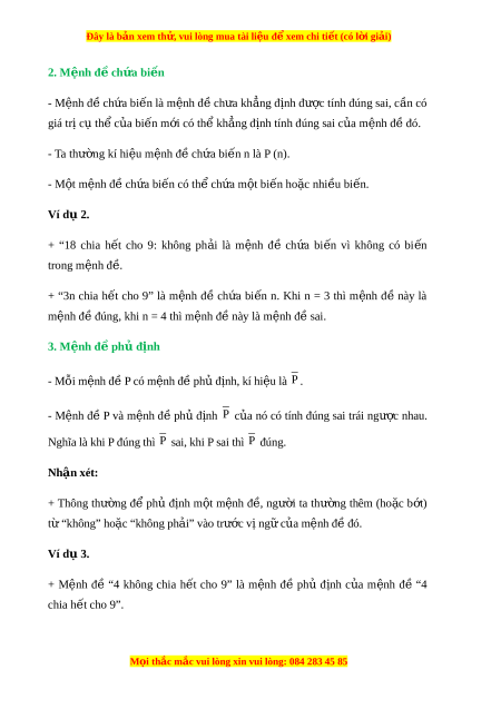 Đây là bản xem th , vu ử i lòng mua tài li u ệ đ xe ể m chi ti t (c ế ó l i ờ gi i ả ) 2. M nh đ ệ ch ề a bi ứ n ế - Mệnh đ ề ch a ứ bi n l ế à m nh đ ệ ề ch a ư kh ng ẳ đ nh đ ị ư c ợ tính đúng sai, c n ầ có giá trị c t ụ h c ể a ủ bi n ế m i ớ có th kh ể ng đ ẳ nh t ị ính đúng sai c a m ủ nh đ ệ đó. ề - Ta thư ng ờ kí hi u m ệ nh đ ệ ch ề a ứ bi n n l ế à P (n). - M t ộ m nh đ ệ ch ề a ứ bi n có t ế h ch ể a ứ m t ộ bi n ho ế c ặ nhi u bi ề n. ế Ví d 2. ụ + “18 chia h t ế cho 9: không ph i ả là m nh ệ đề ch a ứ bi n ế vì không có bi n ế trong m nh đ ệ . ề + “3n chia h t ế cho 9” là m nh ệ đề ch a ứ bi n ế n. Khi n = 3 thì m nh ệ đ ề này là mệnh đ đúng, khi ề n = 4 thì m nh đ ệ này l ề à m nh đ ệ s ề ai. 3. M nh đ ệ ph ề đ ủ nh ị - M i ỗ m n ệ h đ ề P có m n ệ h đ ề ph ủ đ n ị h, kí hi u ệ là P . - M n ệ h đề P và m n ệ h đề ph ủ đ n ị h P c a