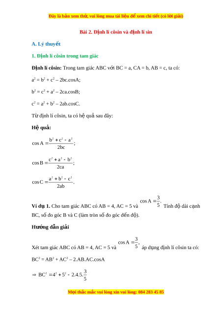 Đây là bản xem th , vu ử i lòng mua tài li u ệ đ xe ể m chi ti t ế (có l i ờ gi i ả ) Bài 2. Đ nh l ị í côsin và đ n ị h lí sin A. Lý thuy t ế 1. Đ nh l ị