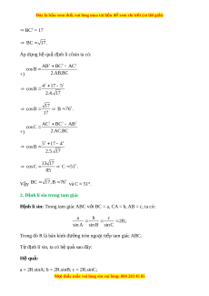 Đây là bản xem th , vu ử i lòng mua tài li u ệ đ xe ể m chi ti t (c ế ó l i ờ gi i ả ) BC2 = 17 BC 17. Áp d ng ụ h qu ệ ả đ nh l ị í côsin ta có: 2 2 2 AB BC AC cos B +) 2.AB.BC 2 2 4 17 5 cos B 2.4. 17 17 cos B B 76 . 17 2 2 2 AC BC AB cos C +) 2.AC.BC 2 2 5 17 4 cos B 2.5. 17 13 17 cos C C 5 1 . 85 V y ậ BC 17,B 7 6 và C ≈ 51°. 2. Đ nh l ị í sin trong tam giác Đ nh l ị