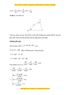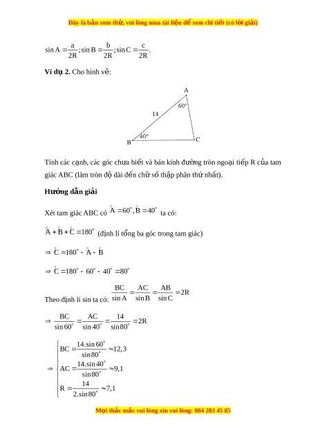 Đây là bản xem th , vu ử i lòng mua tài li u ệ đ xe ể m chi ti t ế (có l i ờ gi i ả ) a b c sin A ;sin B ;sin C . 2R 2R 2R Ví d 2. ụ Cho hình v : ẽ Tính các c nh, ạ các góc ch a ư bi t ế và bán kính đư ng ờ tròn ngo i ạ ti p ế R c a ủ tam giác ABC (làm tròn đ dài ộ đ n ch ế s ữ t ố h p ậ phân th nh ứ t ấ ). Hư ng ớ d n gi ẫ i ả Xét tam giác ABC có A 6 0 , B 40 ta có: A B C 1