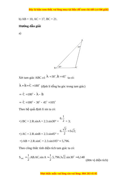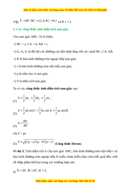 Đây là bản xem th , vu ử i lòng mua tài li u ệ đ xe ể m chi ti t (c ế ó l i ờ gi i ả ) V y ậ C 80 ; BC 12 ,3; AC 9 ,1 và R ≈ 7,1. 3. Các công th c t ứ ính di n t ệ ích tam giác
