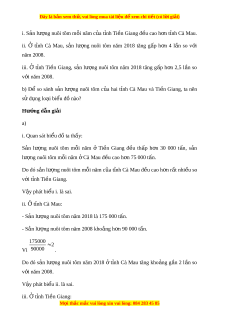 ợ nuôi tôm năm 2018 tăng g p ấ h n ơ 2,5 l n ầ so v i ớ năm 2008. b) Để so sánh s n ả lư ng ợ nuôi tôm c a ủ hai t nh ỉ Cà Mau và Ti n ề Giang, ta nên sử d ng l ụ o i ạ bi u ể đồ nào? Hư ng d ớ ẫn gi i ả a) i. Quan sát bi u đ ể ồ ta th y ấ : S n ả lư ng ợ nuôi tôm m i ỗ năm ở Ti n ề Giang đ u ề th p ấ h n ơ 30 000 t n, ấ s n ả lư ng ợ nuôi tôm m i ỗ năm C ở à Mau đ u ề cao h n 75 000 t ơ n. ấ Do đó s n l ả ư ng ợ nuôi tôm m i ỗ năm c a ủ t nh C ỉ à Mau đ u ề cao h n r ơ t ấ nhi u ề so v i ớ tỉnh Ti n G ề iang. V y ậ phát bi u i ể . là sai. ii. t Ở nh C ỉ à Mau: - S n l ả ư ng