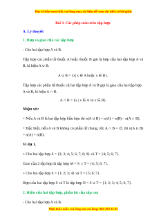 Bài 3. Các phép toán trên t p h ậ p ợ A. Lý thuy t ế 1. H p và gi ợ ao c a các t ủ p h ậ p ợ - Cho hai t p h ậ p ợ A và B. T p ậ h p ợ các ph n ầ tử thu c ộ A ho c ặ thu c ộ B g i ọ là h p ợ c a ủ hai t p ậ h p ợ A và B, kí hi u ệ A ∪ B. A ∪ B = {x| x ∈ A ho c ặ x ∈ B}. T p h ậ p các ợ ph n t ầ t ử hu c ộ c hai ả t p ậ h p ợ A và B g i ọ là giao c a hai ủ t p ậ h p ợ A và B, kí hi u ệ A ∩ B.