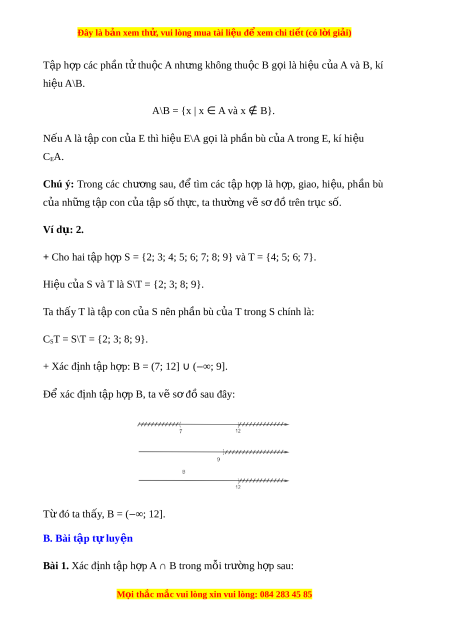 ủ S và T là S\T = {2; 3; 8; 9}. Ta thấy T là t p ậ con c a ủ S nên ph n bù c ầ a ủ T trong S chính là: CST = S\T = {2; 3; 8; 9}. + Xác đ nh t ị p ậ h p: ợ B = (7; 12] ∪ ( ∞ ‒ ; 9]. Để xác định t p h ậ p B ợ , ta v s ẽ đ ơ s ồ au đây: T đó t ừ a th y ấ , B = ( ∞ ‒ ; 12]. B. Bài t p t ậ l ự uy n ệ