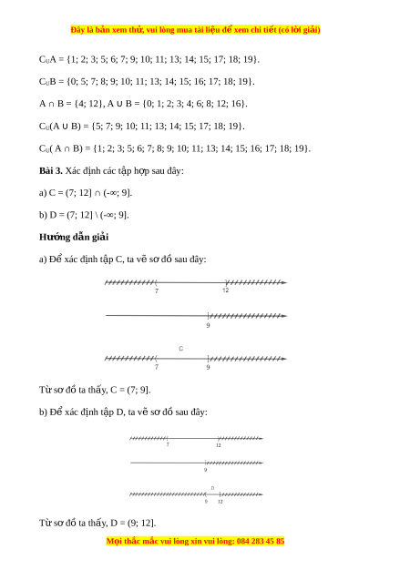 Bài 3. Xác định các t p ậ h p s ợ au đây: a) C = (7; 12] ∩ (-∞; 9]. b) D = (7; 12] \ (-∞; 9]. Hư ng d ớ ẫn gi i ả a) Đ xác ể đ nh t ị p ậ C, ta v s ẽ ơ đ s ồ au đây: T s ừ ơ đồ ta th y ấ , C = (7; 9]. b) Đ xác đ ể ịnh t p ậ D, ta v s ẽ đ ơ s ồ au đây: T s ừ ơ đồ ta th y ấ , D = (9; 12]. M i ọ thắc m c