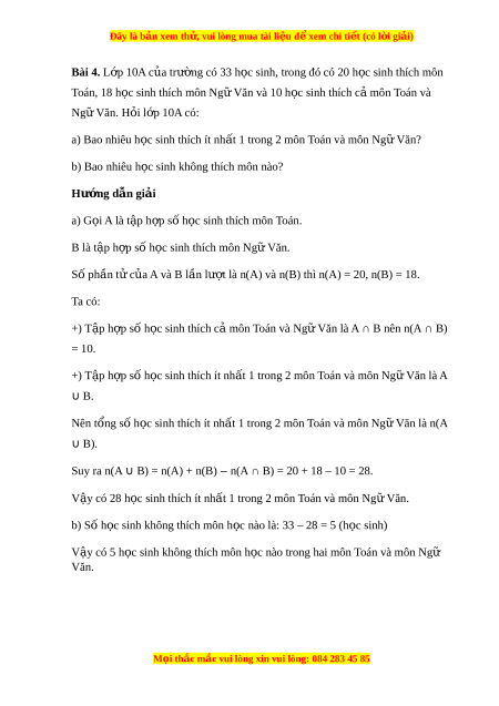 Bài 4. L p 10A c a tr ng có 33 h c sinh, trong đó có 20 h c sinh thích môn ớ ủ ườ ọ ọ