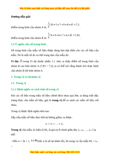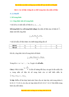 Đây là bản xem th , vu ử i lòng mua tài li u ệ đ xe ể m chi ti t ế (có l i ờ gi i ả ) Bài 3. Các s đ ố ặc tr ng đo xu t ư h t ế rung tâm c a m ủ u s ẫ l ố i u ệ A. Lý thuy t ế 1. S t ố rung bình 1.1. Công th c t ứ ính s t ố rung bình • Gi s ả ử ta có m t ộ mẫu số li u l ệ à x1, x2, …, xn. S t