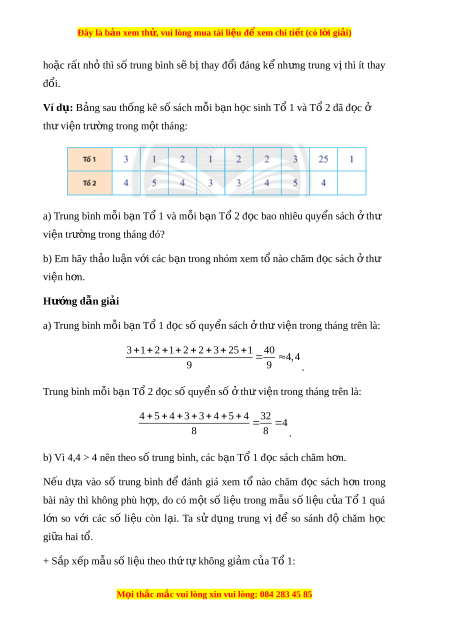 ấ nhỏ thì số trung bình s ẽ b ịthay đ i ổ đáng k ể nh ng ư trung v ịthì ít thay đổi. Ví d : ụ B ng s ả au thống kê s s ố ách m i ỗ b n ạ h c s ọ inh T 1 và ổ T 2 đã đ ổ c ọ ở th vi ư ện trư ng t ờ rong m t ộ tháng: a) Trung bình mỗi b n ạ T 1 và m ổ i ỗ b n ạ T 2 đ ổ c ọ bao nhiêu quy n s ể ách t ở h ư viện trư ng t ờ rong tháng đó? b) Em hãy th o ả lu n v ậ i ớ các b n t