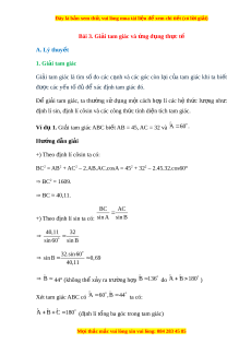 Bài 3. Giải tam giác và ng d ứ ng t ụ h c t ự ế A. Lý thuy t ế 1. Giải tam giác Gi i ả tam giác là tìm s ố đo các c nh ạ và các góc còn l i ạ c a ủ tam giác khi ta bi t ế đư c các ợ y u t ế ố đ đ ủ xác đ ể nh t ị am giác đó. Để gi i ả tam giác, ta thư ng ờ sử d ng ụ m t ộ cách h p ợ lí các h ệ th c ứ lư ng ợ nh : ư định lí sin, đ nh l ị