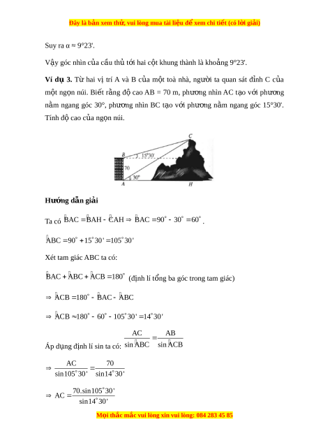 Ví dụ 3. Từ hai vị trí A và B c a ủ m t ộ toà nhà, ngư i ờ ta quan sát đ nh ỉ C c a ủ m t ộ ng n ọ núi. Bi t ế r ng ằ đ ộ cao AB = 70 m, phư ng ơ nhìn AC t o ạ v i ớ phư ng ơ n m ằ ngang góc 30°, phư ng ơ nhìn BC t o ạ v i ớ phư ng ơ n m ằ ngang góc 15°30'. Tính đ cao ộ c a ng ủ n ọ núi. Hư ng ớ d n gi ẫ i ả Ta có BAC B AH CAH BAC 9 0 30 6 0 . ABC 9 0 15 30 ' 1 05 30 ' Xét tam giác ABC ta có: BAC ABC ACB 1