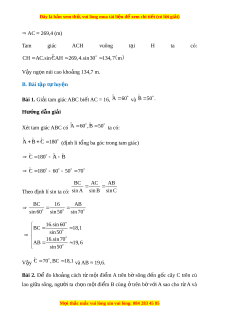 Đây là bản xem th , vu ử i lòng mua tài li u ệ đ xe ể m chi ti t (c ế ó l i ờ gi i ả ) AC ≈ 269,4 (m) Tam giác ACH vuông t i ạ H ta có: CH A C.sin CAH 2 69, 4.sin 30 1 34, 7 m V y ậ ng n núi ọ cao kho ng ả 134,7 m. B. Bài t p t ậ l ự uy n ệ Bài 1. Gi i ả tam giác ABC bi t ế AC = 16, A 60 và B 5 0 . Hư ng d ớ ẫn gi i ả Xét tam giác ABC có A 6 0 , B 5 0 ta có: A B C 1