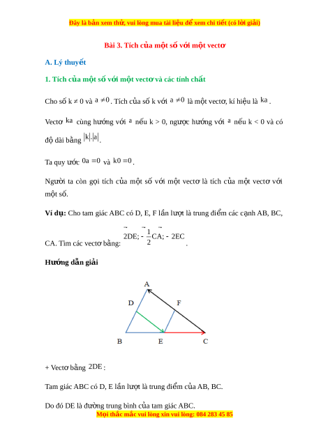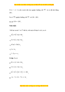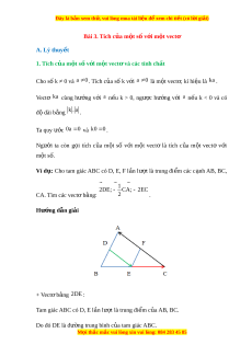 Đây là bản xem th , vu ử i lòng mua tài li u ệ đ xe ể m chi ti t ế (có l i ờ gi i ả ) Bài 3. Tích c a m ủ t ộ số v i ớ m t ộ vectơ A. Lý thuy t ế 1. Tích c a m ủ t ộ s v ố i ớ m t ộ vect và các ơ tính ch t ấ Cho số k ≠ 0 và a 0 . Tích c a s ủ ố k v i ớ a 0 là m t ộ vect , ơ kí hi u l ệ à ka. Vectơ ka cùng hư ng ớ v i ớ a n u ế k > 0, ngư c ợ hư ng ớ v i ớ a n u ế k < 0 và có đ dài ộ b ng ằ k . a . Ta quy ư c ớ 0a 0 và k0 0 . Ngư i ờ ta còn g i ọ tích c a ủ m t ộ số v i ớ m t ộ vectơ là tích c a ủ m t ộ vectơ v i ớ m t ộ số. Ví d :