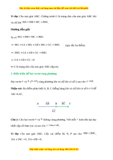 MG GA MG GB MG GC 3 MG (quy t c ba ắ đi m ể ) 3MG GA GB GC 3 MG GA GB GC 0 ⇔ G là tr ng ọ tâm c a t ủ am giác ABC (đpcm). 2. Đi u ki ề n đ ệ hai ể vect cùng p ơ hư ng ơ Hai vectơ a và b ( b 0 ) cùng phư ng khi ơ và ch khi ỉ có s k s ố ao cho a k b . Nhận xét: Ba đi m ể phân bi t ệ A, B, C th ng ẳ hàng khi và ch khi ỉ có s k ≠ ố 0 để AB k AC .