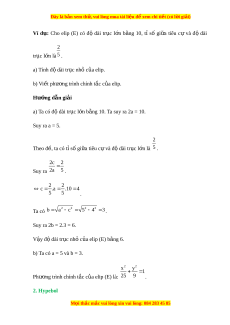 Ta có b a c 5 4 3 . Suy ra 2b = 2.3 = 6. V y đ ậ ộ dài tr c ụ nh c ỏ a el ủ ip (E) b ng 6. ằ b) Ta có a = 5 và b = 3. 2 2 x y 1 Phư ng t ơ rình chính t c c ắ a ủ elip (E) là: 25 9 . 2. Hypebol M i
