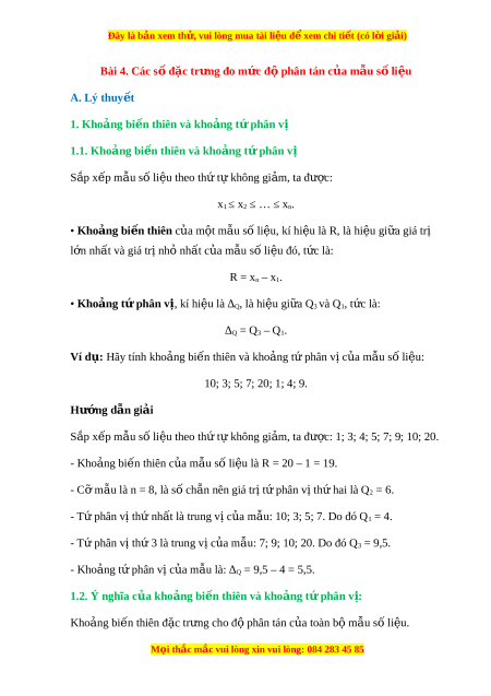 Đây là bản xem th , vu ử i lòng mua tài li u ệ đ xe ể m chi ti t ế (có l i ờ gi i ả ) Bài 4. Các s đ ố ặc tr ng đo m ư c đ ứ phâ ộ n tán c a m ủ u s ẫ l ố i u ệ A. Lý thuy t ế 1. Khoảng bi n t ế hiên và kho ng t ả p ứ hân v ị 1.1. Khoảng bi n t ế hiên và kho ng t ả p ứ hân vị S p x ắ p m ế ẫu số li u t ệ heo th t ứ không gi ự m ả , ta được: x1 ≤ x2 ≤ … ≤ xn. • Khoảng bi n t ế hiên c a ủ m t