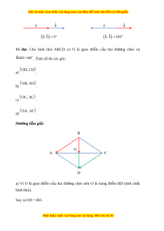OB b . Góc AOB v i ớ số đo t 0° đ ừ n 180° đ ế ư c ợ g i ọ là góc gi a ữ hai vect ơ a và b . a, b Ta kí hiệu góc gi a ữ hai vect ơ a và b là . a, b 90 N u ế thì ta nói r ng ằ a và b vuông góc v i ớ nhau, kí hi u ệ a b . Chú ý: a, b b, a + T đ ừ nh nghĩ ị a, ta có . + Góc gi a hai ữ vectơ cùng hư ng và ớ khác 0 luôn b ng 0°. ằ + Góc gi a hai ữ vectơ ngư c h ợ ư ng ớ và khác 0 luôn b ng ằ 180°. + Trong trư ng ờ h p ợ có ít nh t ấ m t ộ trong hai vectơ a ho c ặ b là 0 thì ta quy ư c s ớ ố đo góc gi a hai ữ vectơ đó là tùy ý (t ừ 0° đ n 180°) ế . M i