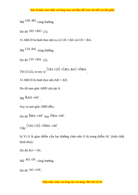 Vì ABCD là hình thoi nên ta có CD // BA và CD = BA. Mà CD, BA cùng hư ng. ớ Do đó CD B A (2). OD, CD BO, BA O BA T ( ừ 1) (2), ta suy ra .