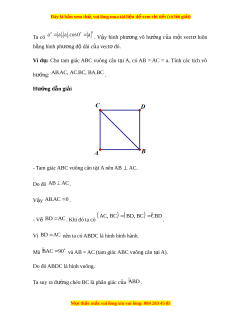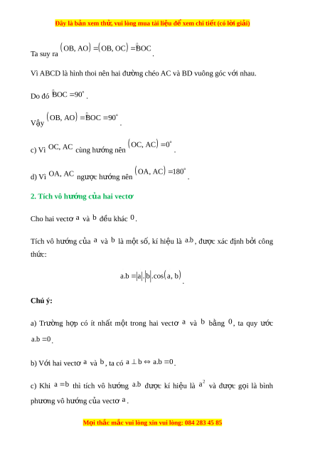 Vì ABCD là hình thoi nên hai đư ng chéo ờ AC và BD vuông góc v i ớ nhau. Do đó BOC 90 . OB, AO B OC 90 V y ậ . OC, AC 0 c) Vì OC, AC cùng hư ng ớ nên . OA, AC 1 80 d) Vì OA, AC ngư c h ợ ư ng ớ nên . 2. Tích vô hư ng c ớ a hai ủ vectơ Cho hai vect ơ a và b đ u khác ề 0 . Tích vô hư ng ớ c a ủ a và b là m t ộ s , ố kí hi u ệ là a.b , đư c ợ xác đ nh ị b i ở công th c: ứ a. b a . b .cos a, b . Chú ý: a) Trư ng ờ h p ợ có ít nh t ấ m t