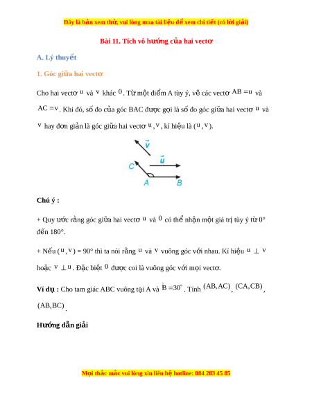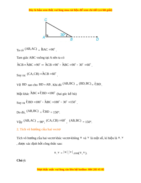 Đây là bản xem th , vu ử i lòng mua tài li u ệ đ xe ể m chi ti t (c ế ó l i ờ gi i ả ) Ta có (AB,AC) = BAC 9 0 . Tam giác ABC vuông t i ạ A nên ta có ACB ABC 9 0 ACB 9 0 ABC 9 0 30 6 0 . Suy ra: (CA,CB) A CB 6 0 .