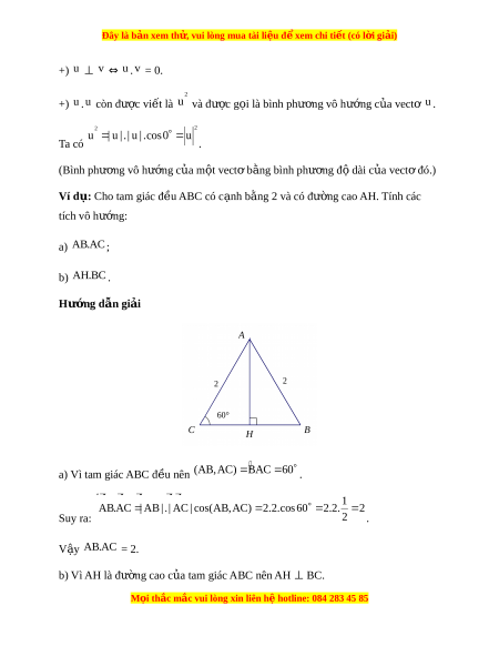 Đây là bản xem th , vu ử i lòng mua tài li u ệ đ xe ể m chi ti t (c ế ó l i ờ gi i ả ) +) u ⊥ v ⇔ u . v = 0. 2 +) u . u còn đư c ợ vi t ế là u và đư c ợ g i ọ là bình phư ng vô h ơ ư ng ớ c a vect ủ ơ u . 2 2 u | u | .| u | .cos 0 u Ta có . (Bình phư ng ơ vô hư ng c ớ a ủ m t ộ vect b ơ ng ằ bình phư ng đ ơ dài ộ c a ủ vect đó.) ơ Ví d : ụ Cho tam giác đ u ề ABC có c nh b ạ ng ằ 2 và có đư ng cao ờ AH. Tính các tích vô hư ng: ớ a) AB.AC ; b) AH.BC . Hư ng d ớ ẫn gi i ả a) Vì tam giác ABC đ u nên ề (AB,AC) B AC 60 . 1 AB.AC | AB | . | AC | cos(AB, AC) 2 .2.cos 60 2 .2. 2 Suy ra: 2 . V y ậ AB.AC = 2. b) Vì AH là đư ng cao ờ c a t
