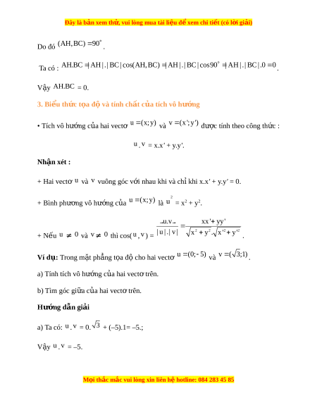 Đây là bản xem th , vu ử i lòng mua tài li u ệ đ xe ể m chi ti t (c ế ó l i ờ gi i ả ) Do đó (AH,BC) 9 0 . Ta có : AH.BC | AH | . | BC | cos(AH, BC) | AH | .| BC | cos90 | AH | .| BC | .0 0 . V y ậ AH.BC = 0. 3. Bi u ể th c t ứ a đ ọ và t ộ ính ch t ấ c a t ủ ích vô hư ng ớ • Tích vô hư ng ớ c a hai ủ vectơ u ( x; y) và v ( x '; y ') đư c ợ tính theo công th c ứ :
