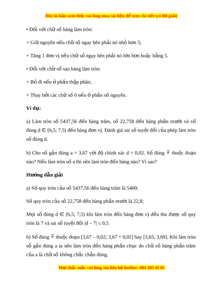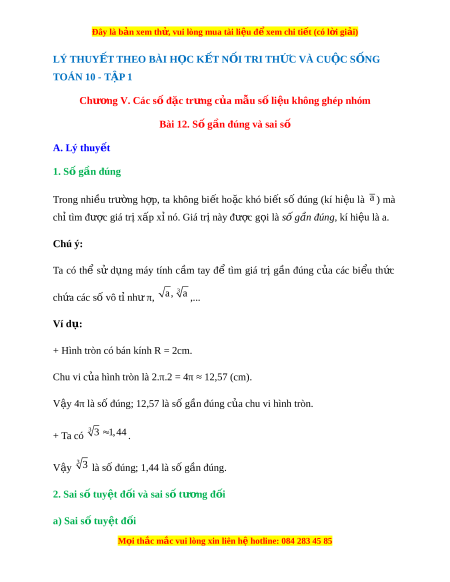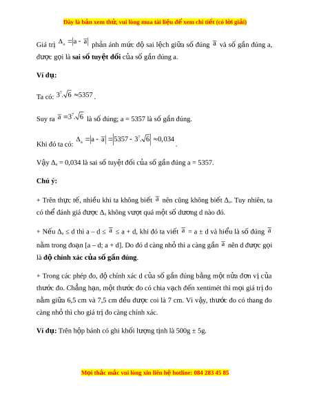 Đây là bản xem th , vu ử i lòng mua tài li u ệ đ xe ể m chi ti t (c ế ó l i ờ gi i ả ) Giá trị a a a ph n ả ánh m c ứ độ sai l ch ệ gi a ữ số đúng a và số g n ầ đúng a, đư c ợ g i ọ là sai số tuy t ệ đ i ố c a s ủ ố gần đúng a. Ví d : ụ 7 Ta có: 3 . 6 5357 . 7 Suy ra a 3