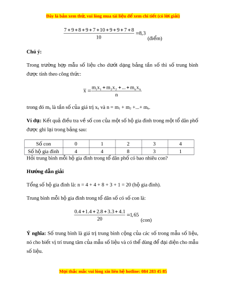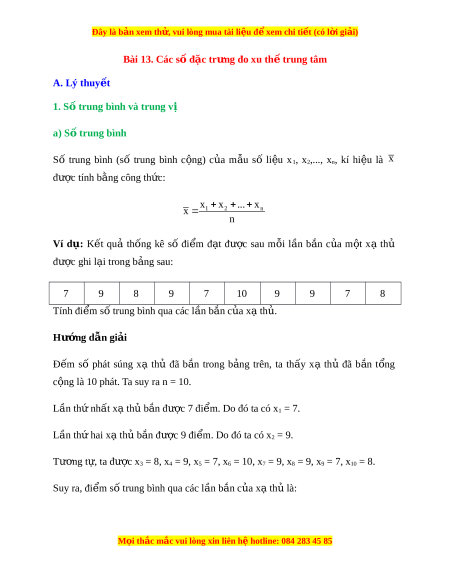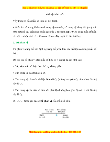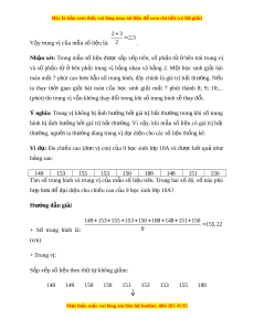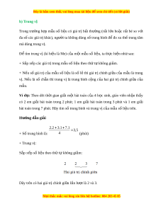 Đây là bản xem th , vu ử i lòng mua tài li u ệ đ xe ể m chi ti t (c ế ó l i ờ gi i ả ) b) Trung vị Trong trư ng ờ h p ợ m u ẫ số li u ệ có giá tr ịb t ấ thư ng ờ (r t ấ l n ớ ho c ặ r t ấ bé so v i ớ đa số các giá tr ị khác), ngư i ờ ta không dùng s t ố rung bình đ ể đo xu th t ế rung tâm mà dùng trung v . ị Để tìm trung v ( ị kí hi u l ệ à Me) c a ủ m t ộ m u s ẫ ố li u, t ệ a th c ự hi n nh ệ s ư au: + S p ắ x p các gi ế á tr t ị rong m u s ẫ l ố i u t ệ heo th t ứ không gi ự m ả . + N u ế số giá tr ịc a ủ m u ẫ số li u ệ là s ố l