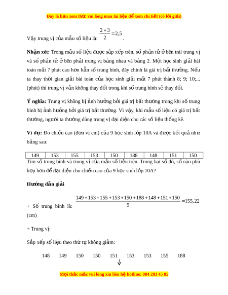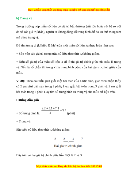 Đây là bản xem th , vu ử i lòng mua tài li u ệ đ xe ể m chi ti t (c ế ó l i ờ gi i ả ) 2 3 2 ,5 V y ậ trung v c ị a ủ m u s ẫ l ố i u l ệ à: 2 . Nhận xét: Trong m u ẫ số li u ệ đư c ợ s p ắ x p ế trên, s ố ph n ầ t ử ở bên trái trung vị và số ph n ầ tử ở bên ph i ả trung vị b ng ằ nhau và b ng ằ 2. M t ộ h c ọ sinh gi i ả bài toán m t ấ 7 phút cao h n ơ h n