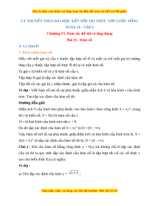Đây là bản xem th , vu ử i lòng mua tài li u ệ đ xe ể m chi ti t (c ế ó l i ờ gi i ả ) LÝ THUY T Ế THEO BÀI H C Ọ K T Ế N I Ố TRI TH C Ứ V I Ớ CU C Ộ S N Ố G TOÁN 10 – TẬP 2 Chư ng ơ VI. Hàm s , ố đ t ồ hị và ng d ứ ng ụ Bài 15. Hàm số A. Lý thuy t ế 1. Khái ni m ệ hàm số N u ế v i ớ m i ỗ giá trị c a ủ x thu c ộ t p ậ h p ợ số D có m t ộ và chỉ m t ộ giá trị tư ng ơ ng c ứ a ủ y thu c t ộ p ậ h p s ợ ố th c ự ℝ thì ta có m t ộ hàm s . ố Ta g i ọ x là bi n ế số và y là hàm s c ố a ủ x. T p h ậ p ợ D g i ọ là t p xác ậ đ nh c ị a ủ hàm s . ố T p t