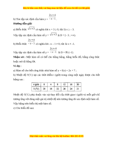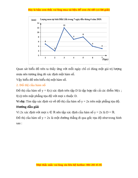 Đây là bản xem th , vu ử i lòng mua tài li u ệ đ xe ể m chi ti t (c ế ó l i ờ gi i ả ) Quan sát bi u ể đồ trên ta th y ấ ng ứ v i ớ m i ỗ ngày chỉ có đúng m t ộ giá trị lư ng ợ m a ư nên tư ng ơ ng đó xác ứ đ nh m ị t ộ hàm s . ố V y ậ bi u đ ể ồ trên bi u t ể h m ị t ộ hàm s . ố 2. Đồ th c ị ủa hàm số Đồ thị c a