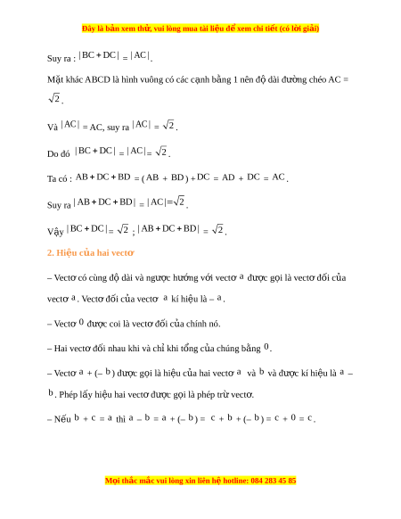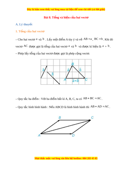Đây là bản xem th , vu ử i lòng mua tài li u ệ đ xe ể m chi ti t (c ế ó l i ờ gi i ả ) Bài 8. T ng và hi ổ u c ệ a hai ủ vectơ A. Lý thuy t ế 1. T ng c ổ a hai ủ vectơ – Cho hai vect ơ a và b . Lấy m t ộ đi m ể A tùy ý và vẽ AB a , BC b . Khi đó