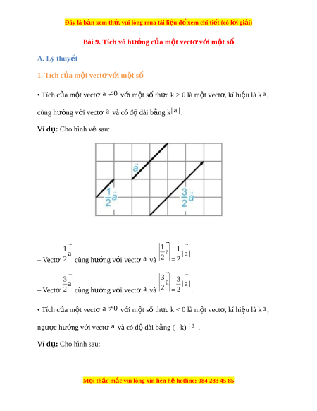 Bài 9. Tích vô hư ng c ớ a m ủ t ộ vectơ v i ớ m t ộ số A. Lý thuy t ế 1. Tích c a m ủ t ộ vect v ơ i ớ m t ộ số • Tích c a ủ m t ộ vect ơ a 0 v i ớ m t ộ số th c k > 0 l ự à m t ộ vect , kí ơ hi u l ệ à k a , cùng hư ng ớ v i ớ vectơ a và có đ dài ộ b ng ằ k| a |. Ví d : ụ Cho hình v s ẽ au: 1 1 1 a a | a | – Vect ơ 2 cùng hư ng v ớ i ớ vect ơ a và 2 = 2 3 3 3 a a | a | – Vect ơ 2 cùng hư ng v ớ i ớ vect ơ a và 2 = 2 . • Tích c a ủ m t ộ vect ơ a 0 v i ớ m t ộ số th c k < 0 l ự à m t ộ vect , kí ơ hi u l ệ à k a ,