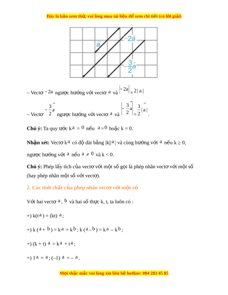 Đây là bản xem th , vu ử i lòng mua tài li u ệ đ xe ể m chi ti t (c ế ó l i ờ gi i ả ) 2a – Vect ơ 2a ngư c ợ hư ng v ớ i ớ vectơ a và = 2 | a | 3 3 3 a a | a | – Vect ơ 2 ngư c h ợ ư ng ớ v i ớ vect ơ a và 2 = 2 . Chú ý: Ta quy ư c ớ ka = 0 n u ế a =0 ho c k = 0. ặ Nhận xét: Vect k ơ a có đ dài ộ b ng ằ |k||a | và cùng hư ng ớ v i ớ a n u k ≥ ế 0, ngư c ợ hư ng v ớ i ớ a n u ế a ≠ 0 và k < 0.