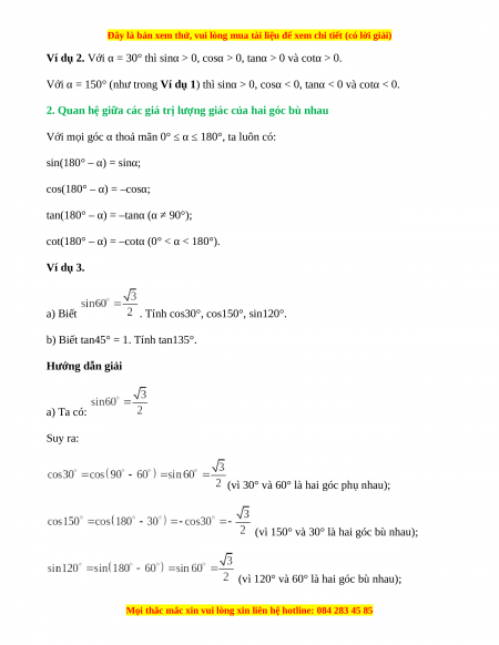 cot(180° ‒ α) = ‒cotα (0° < α < 180°). Ví dụ 3. a) Biết