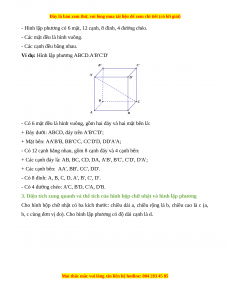 - Hình lập phương có 6 mặt, 12 cạnh, 8 đỉnh, 4 đường chéo.