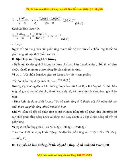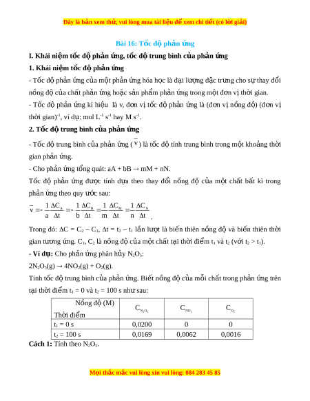 Đây là bản xem th , vu ử i lòng mua tài li u ệ đ xe ể m chi ti t (c ế ó l i ờ gi i ả ) Bài 16: T c đ ố ph ộ n ả ng ứ I. Khái ni m ệ t c đ ố ph ộ n ả ng, t ứ c đ ố t ộ rung bình c a ph ủ n ả ng ứ 1. Khái ni m ệ t c ố đ p ộ h n ả ng ứ - Tốc đ ph ộ n ả ng ứ c a ủ m t ộ ph n ả ng hóa ứ h c ọ là đ i ạ lư ng ợ đ c ặ tr ng ư cho s t ự hay đ i ổ nồng đ c ộ a ủ ch t ấ ph n ả ng ho ứ c ặ s n ả ph m ẩ ph n ả ng t ứ rong m t ộ đ n v ơ t ị h i ờ gian. - T c ố độ ph n ả ng ứ kí hi u ệ là v, đ n ơ v ịt c ố đ ộ ph n ả ng ứ là (đ n ơ v ịn ng ồ đ ) ộ (đ n ơ vị th i ờ gian)-1, ví d : ụ mol L-1 s-1 hay M s-1. 2. T c ố đ t ộ rung bình c a p ủ h n ả ng ứ - Tốc độ trung bình c a ủ ph n ả ng ứ ( v ) là t c ố đ