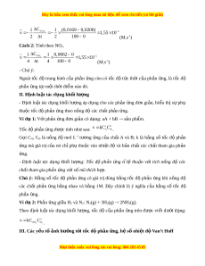 Ngoài tốc độ trung bình c a ủ ph n ả ng ứ còn có t c ố đ ộ t c ứ th i ờ c a ủ ph n ả ng, ứ là t c ố độ ph n ả ng t ứ i ạ m t ộ th i ờ đi m ể nào đó. II. Đ nh l ị u t ậ tác d ng kh ụ i ố lư ng ợ - Đ nh ị lu t ậ tác d ng ụ kh i ố lư ng ợ áp d ng ụ cho các ph n ả ng ứ đ n ơ gi n, ả bi u ể th ịs ự phụ thu c ộ tốc độ ph n ả ng t ứ heo nồng đ các ộ ch t ấ ph n ả ng. ứ Ví d 1 ụ : V i ớ ph n ả ng đ ứ n gi ơ n có ả d ng: ạ aA + bB s n ph ả ẩm. a b Tốc đ ph ộ n ả ng ứ đư c t ợ ính nh s ư au: v kC C A B . G i ọ C -1 A, CB là n ng ồ độ mol L tư ng ơ ng ứ c a ủ ch t ấ A và B; k là h ng ằ số t c ố đ ộ ph n ả ng ứ mà giá trị c a ủ nó chỉ ph ụ thu c ộ vào nhi t ệ đ ộ và b n ả ch t ấ các ch t ấ tham gia ph n ả ng. ứ - Đ nh ị lu t ậ tác d ng ụ kh i ố lư ng: ợ T c ố độ ph n ả ng ứ tỉ lệ thu n ậ v i ớ tích n ng ồ độ các chất tham gia ph n ả ng v ứ i ớ s m ố ũ thích h p. ợ Chú ý: H ng ằ số t c ố độ ph n ả ng ứ có giá trị đúng b ng ằ t c ố đ ộ ph n ả ng ứ khi n ng ồ độ các chất ph n ả ng ứ b ng ằ nhau và b ng