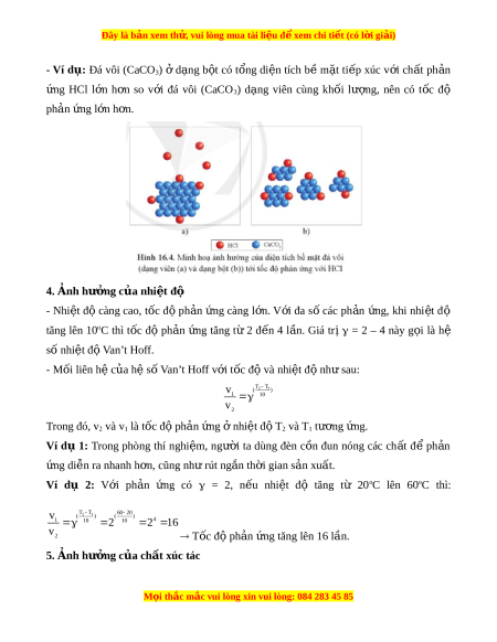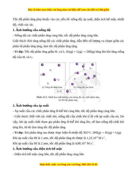 Đây là bản xem th , vu ử i lòng mua tài li u ệ đ xe ể m chi ti t (c ế ó l i ờ gi i ả ) Tốc đ ộ ph n ả ng ứ ph t ụ hu c ộ vào các y u t ế : ố n ng ồ đ , áp ộ su t ấ , di n ệ tích b m ề t ặ , nhi t ệ đ , ộ ch t ấ xúc tác. 1. Ảnh hư ng c ở a n ủ ng đ ồ ộ - Nồng đ các ch ộ ất ph n ả ng càng l ứ n, t ớ ốc đ ph ộ n ả ng càng l ứ n. ớ Gi i ả thích: Khi tăng n ng ồ đ ộ các ch t ấ ph n ả ng, ứ d n ẫ đ n ế s ố lư ng ợ va ch m ạ gi a ữ các phân tử ph n ả ng t ứ ăng, làm tốc đ ph ộ n ả ng t ứ ăng. - Ví d : ụ Tốc độ ph n ả ng ứ gi a